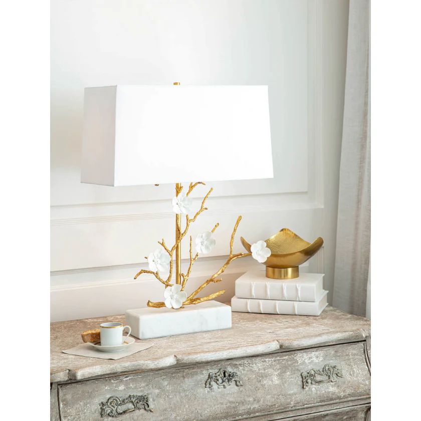 The Cherise features cast metal branches, white porcelain flowers, and a gold finish. It combines balance and proportion with an organic design.