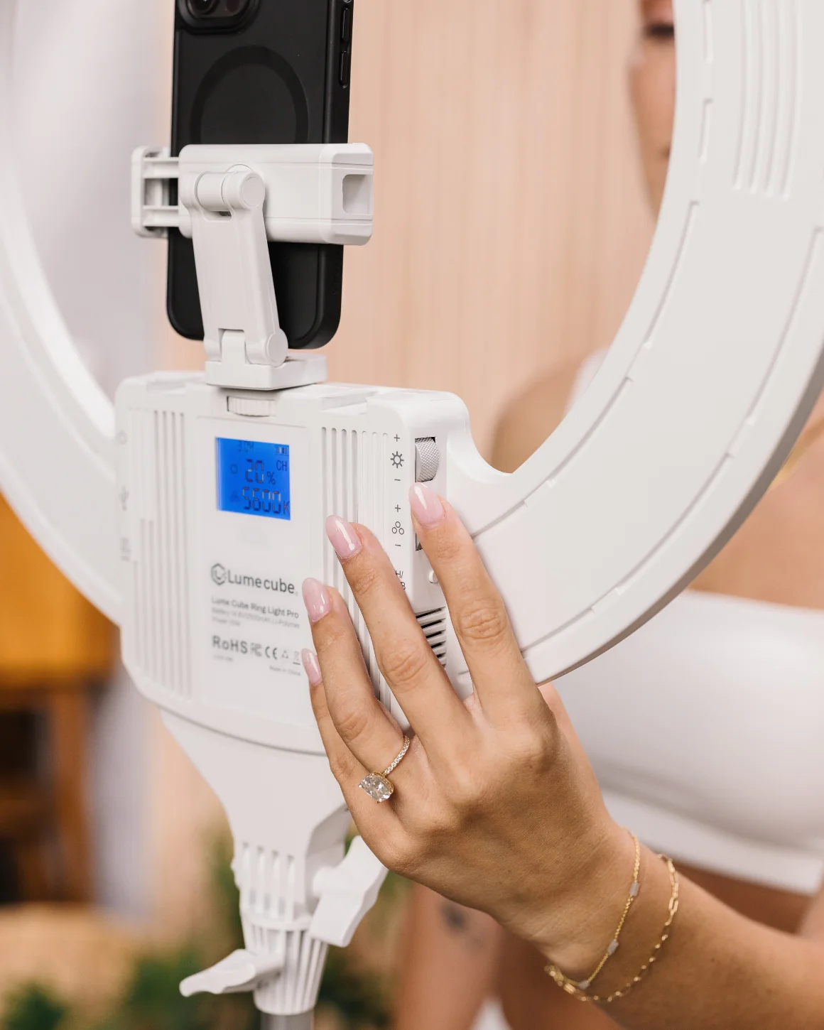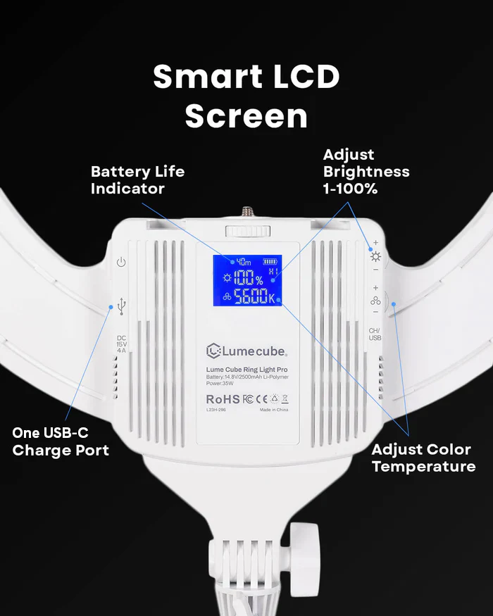 The premium LED ring light incorporates Edge-Lit technology to create an unparalleled lighting experience that provides built-in diffusion to create the softest, most balanced light output possible. Intentionally designed as one of the only ring lights with a built-in lithium-ion battery, you鈥檙e able to create cords-free in any environment, giving you hours of untethered illumination. You鈥檒l experience full creative control with the upgraded all-white wireless remote allowing you to fine-tune your settings from a distance without disrupting your flow. The Ring Light Pro in Special Edition White is designed to work seamlessly with any device, smartphone or camera. We鈥檝e included a 360潞 rotating phone mount and intuitively placed USB-C ports which allow you to charge your device while you capture, while the built-in camera mount allows for any DSLR camera to mount securely in the center for elevated content creation.