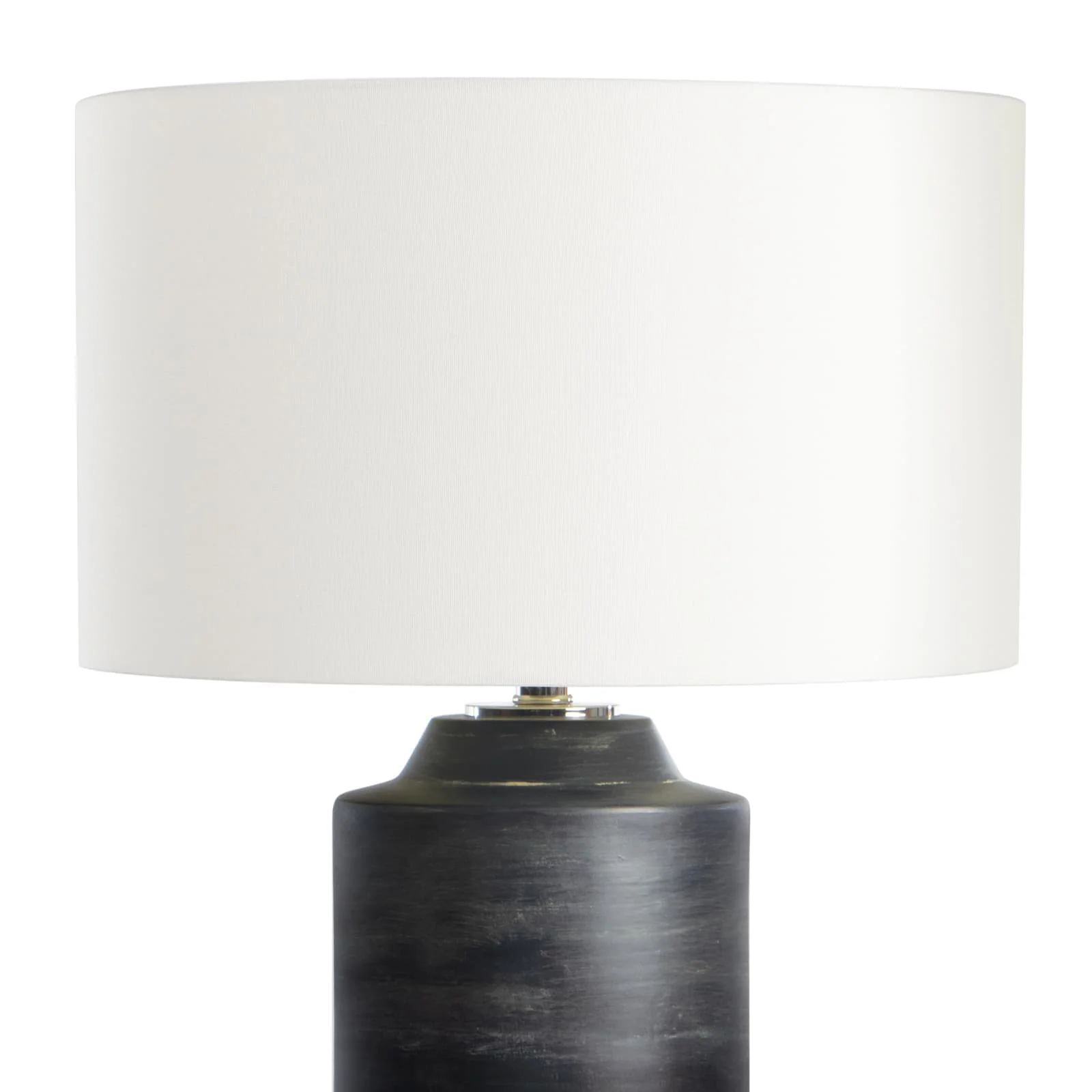 The Dayton ceramic table lamp features a textured, timeworn finish that combines industrial and refined styles. It includes a natural linen drum shade and a polished nickel finial.