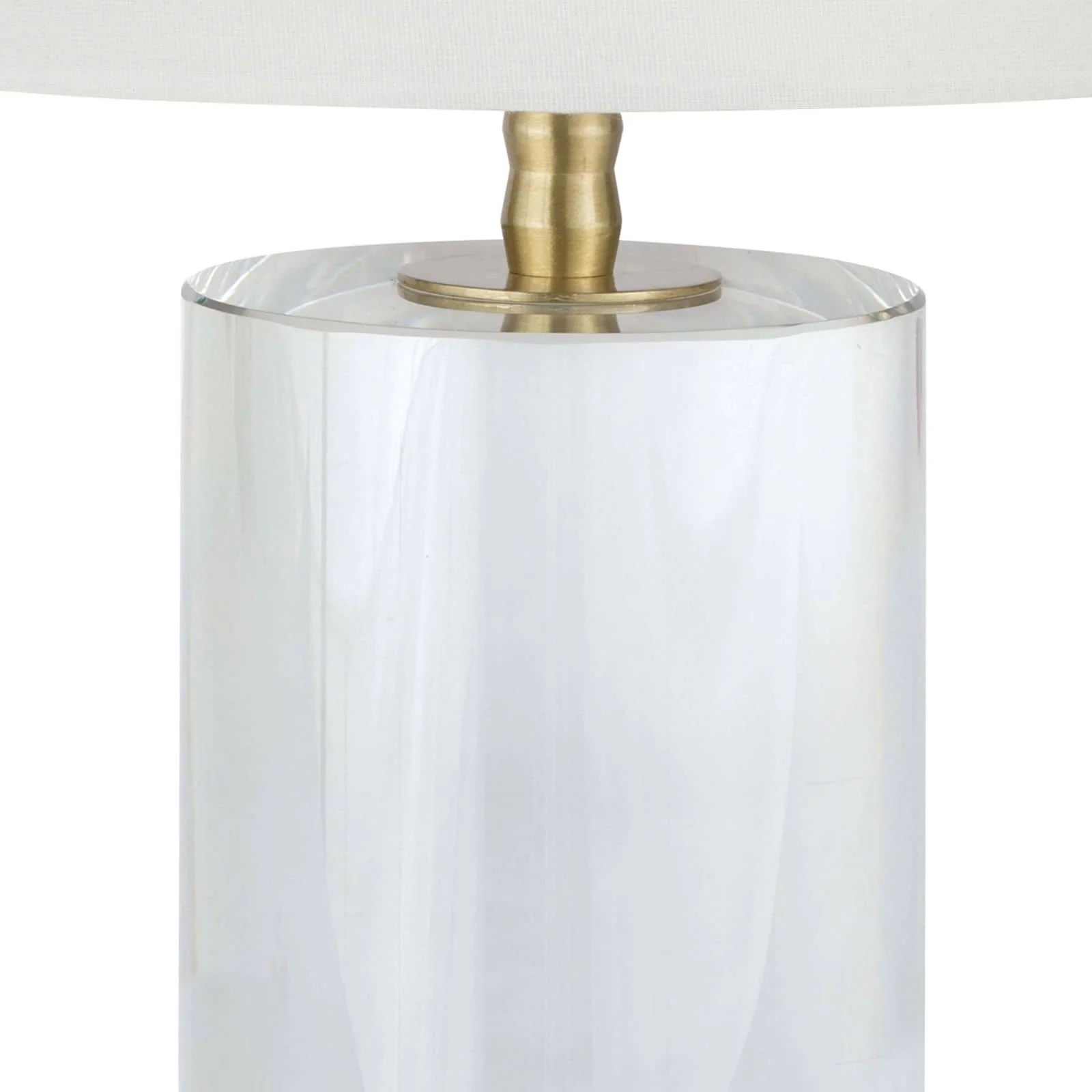 The Juliet Table Lamp features a clear optical crystal base with natural brass hardware and a natural linen drum shade. It provides versatile lighting suitable for living rooms or bedrooms.