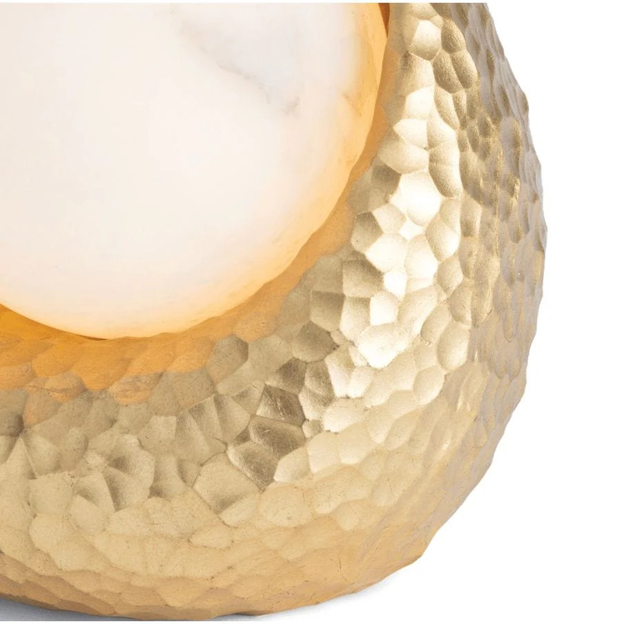 The Nest Mini Lamp is a small, elegant accent light designed to add a soft, ambient glow to any space. It features a gold resin base with detailed texture and a natural alabaster globe.