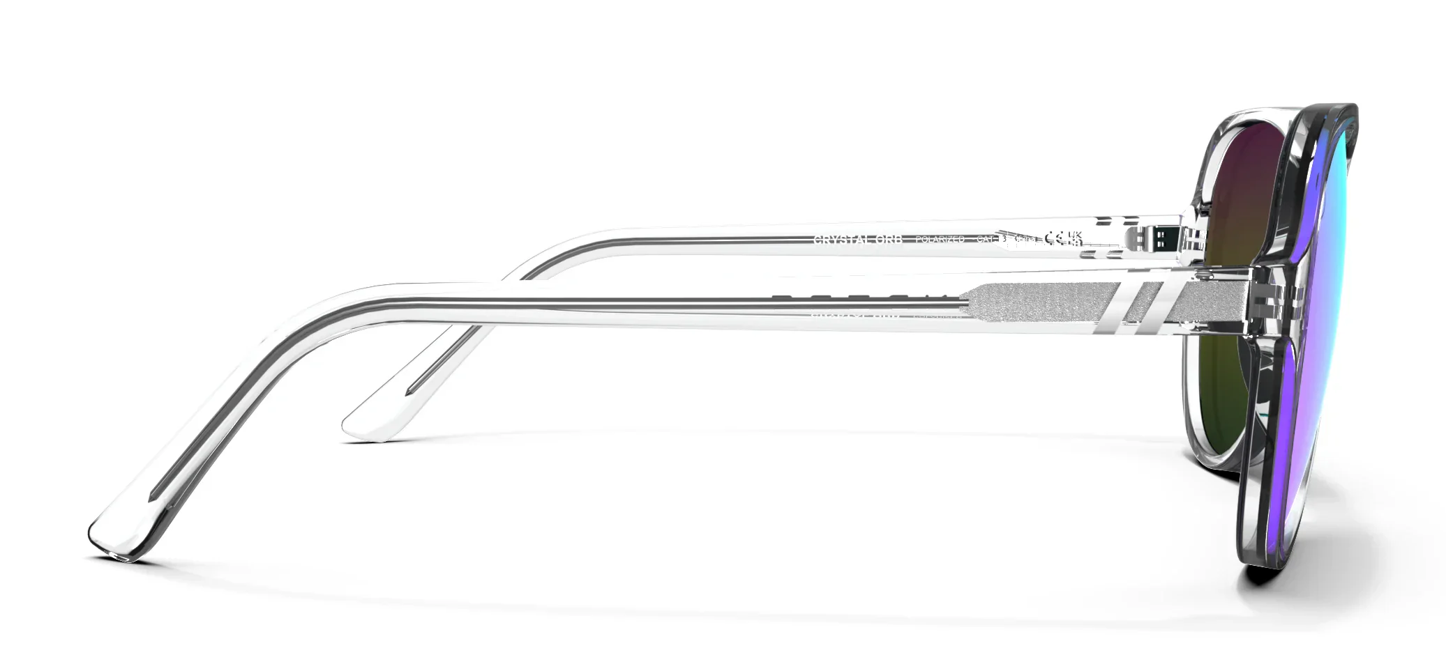 Travel light with the ethereal splendor of 鈥楥rystal Orb.鈥?/strong>The blue-purple polarized lenses seem to float on the face thanks to a crystal clear aesthetic that extends from front frame to temple tips. For some extra dazzle, we鈥檝e incorporated a visible silver metal core that streaks down the sides. Matching silver temple stripes round out the captivating design. //